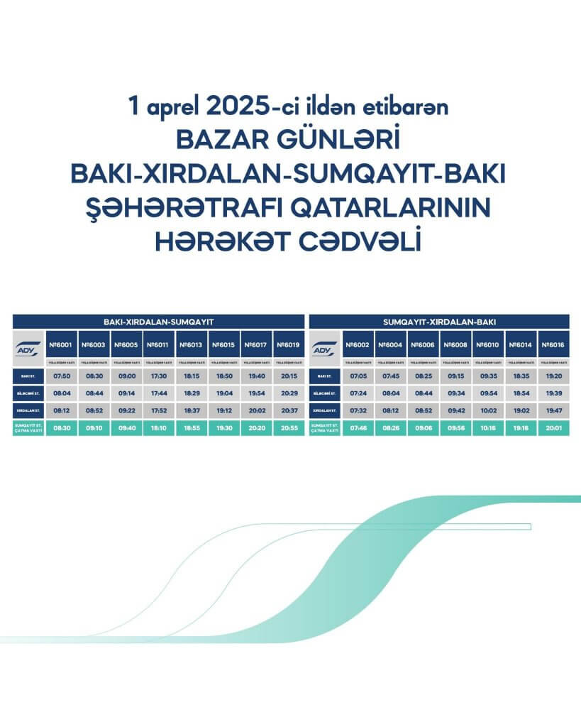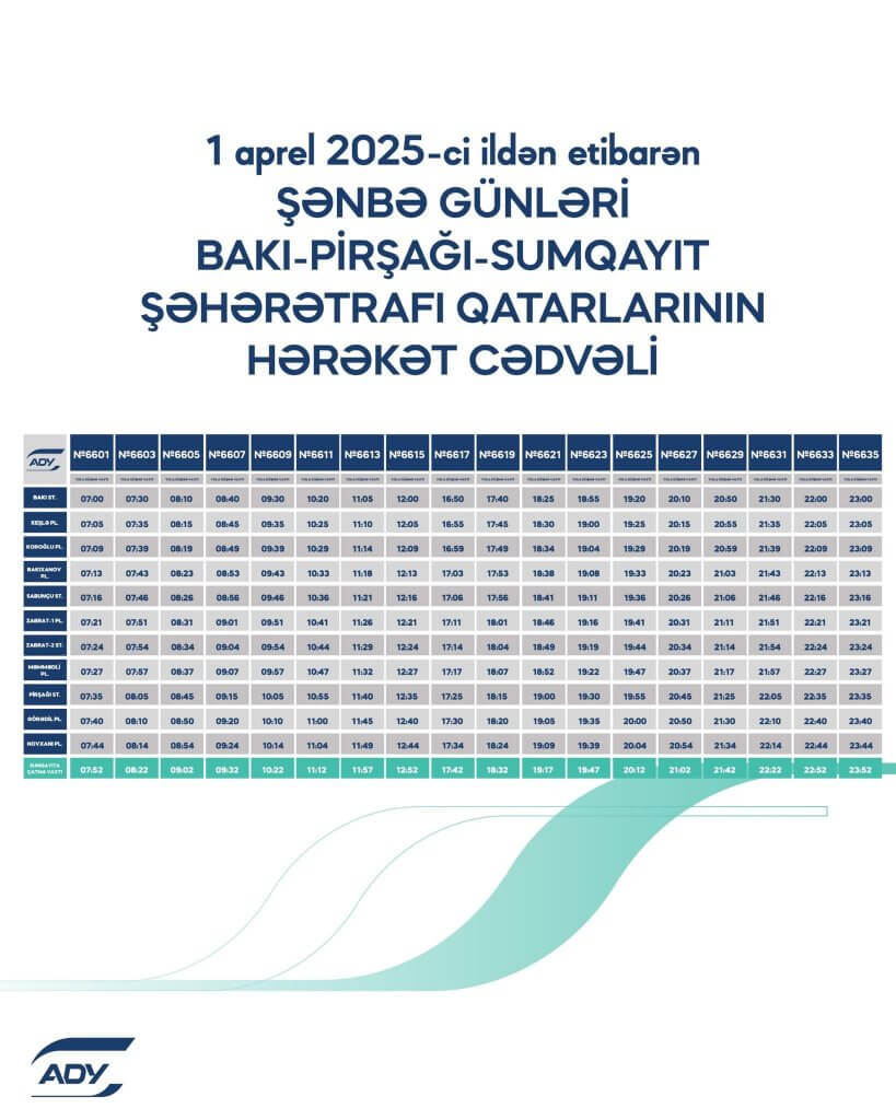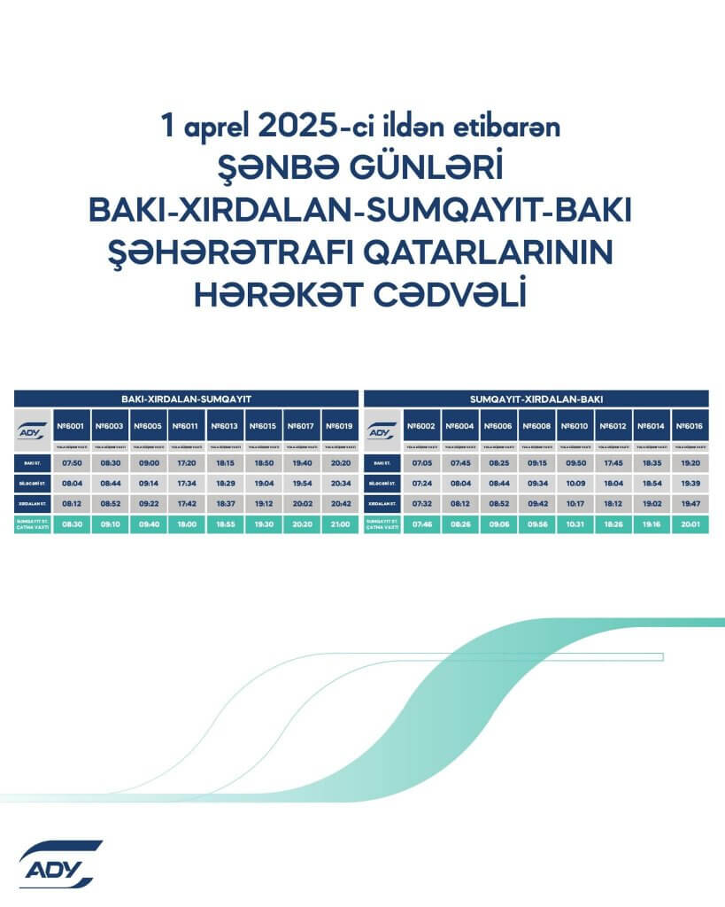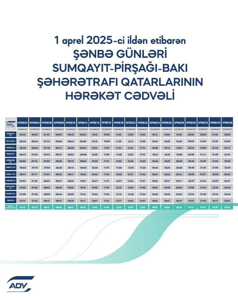 Şənbə günlərində Bakı–Xırdalan–Sumqayıt–Bakı marşrutu üzrə reyslərin sayı 10-dan 16-ya, Bakı–Pirşağı–Sumqayıt–Bakı xətti üzrə reyslərin sayı isə 20-dən 36-ya çatdırılacaq.