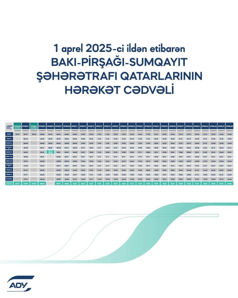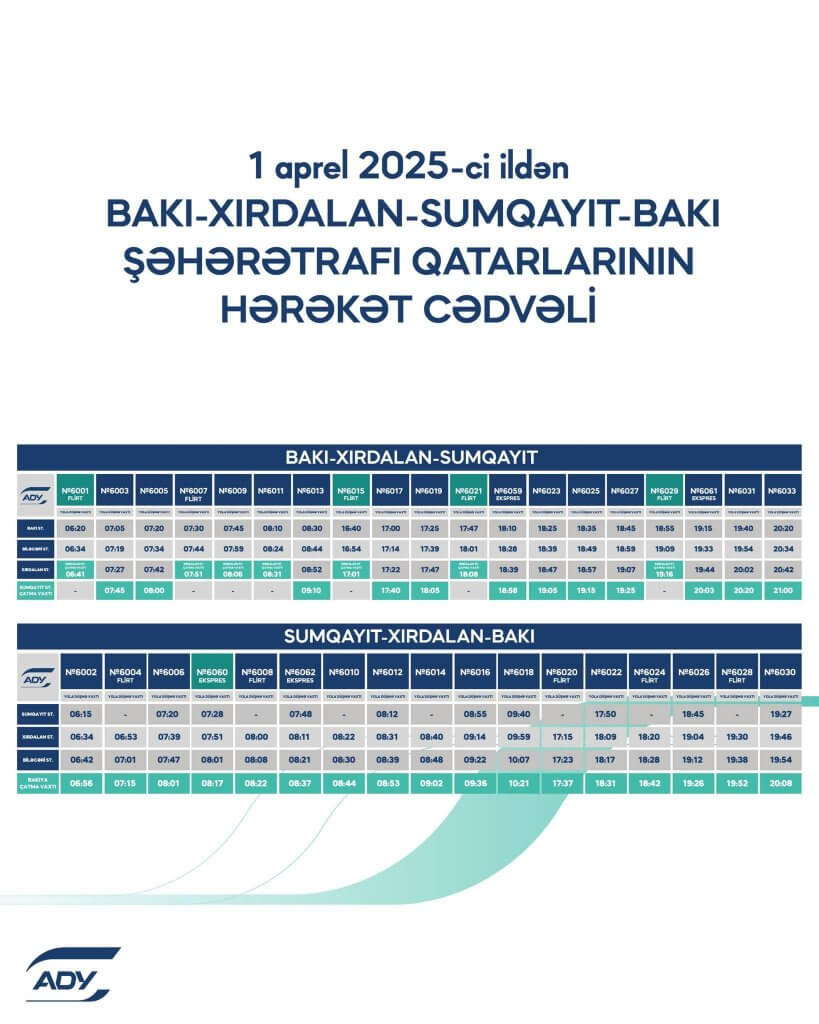İndex.az ADY-yə istinadən xəbər verir ki, yeni hərəkət cədvəlinə əsasən, Bakı–Pirşağı–Sumqayıt və Bakı–Xırdalan–Sumqayıt marşrutları üzrə reyslərin sayı artırılır və xüsusən günorta saatlarında qatarlararası interval azaldılır. Həmçinin sürət qatarlarının iş günləri, şənbə və bazar günləri üçün ayrı-ayrılıqda üç hərəkət cədvəli tərtib edilib. Abşeron dairəvi dəmiryol marşrutu üzrə həftənin iş, şənbə və bazar günləri ümumilikdə 61 reys əlavə olunur.