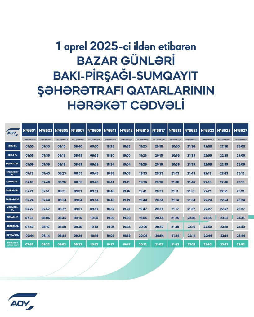 Optimallaşdırma çərçivəsində həftənin bazar günləri üçün də xüsusi qrafik tərtib olunub. Belə ki, yeni cədvələ əsasən, bazar günləri Bakı–Xırdalan–Sumqayıt–Bakı marşrutu üzrə reyslərin sayı 10-dan 15-ə, Bakı–Pirşağı–Sumqayıt–Bakı xətti üzrə reyslərin sayı isə 20-dən 28-ə çatdırılacaq.