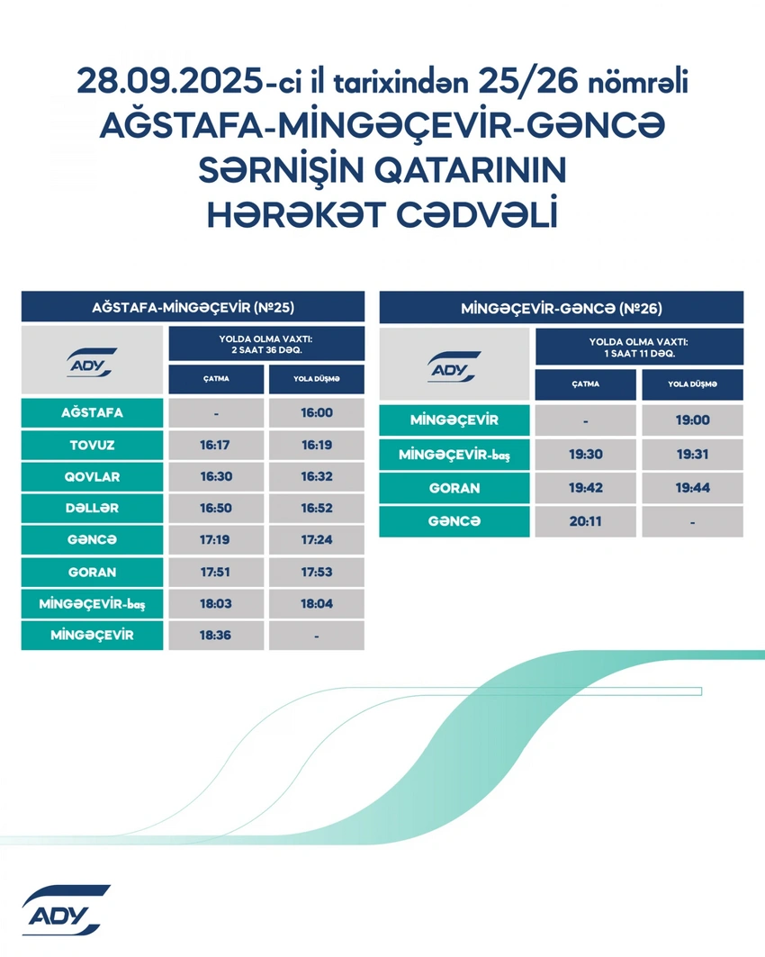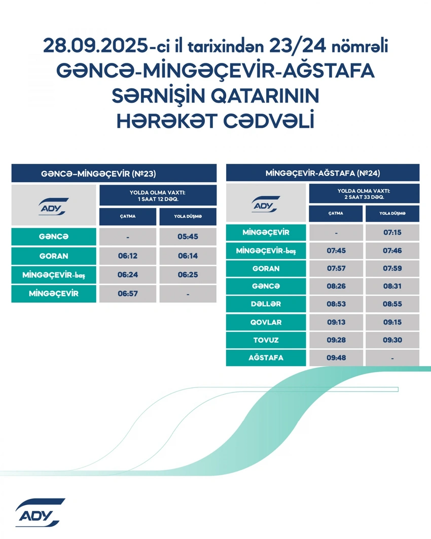 İndex.az ADY-yə istinadən xəbər verir ki, Azərbaycanda dəmir yollarının yaranmasının 145 illiyi ərəfəsində – sentyabrın 28-dən etibarən müasir elektrik qatarları ilə Gəncə–Mingəçevir–Ağstafa marşrutu üzrə gündə 2 dəfə sərnişinlərə xidmət göstəriləcək.