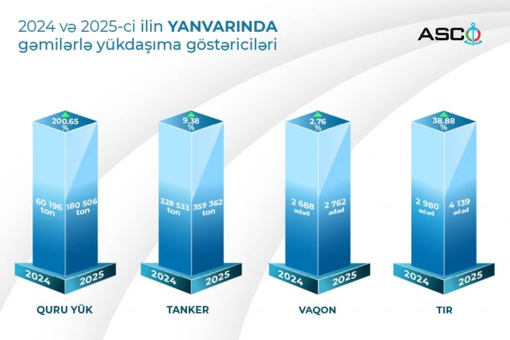 Bu ilin ilk ayında ən böyük artım quru yük daşımalarında qeydə alınıb. 2024-cü ilin yanvarında 60 196 ton quru yük daşınmışdısa, bu göstərici 2025-ci ilin eyni ayında 180 506 tona yüksəlib, yəni 3 dəfə artım baş verib.