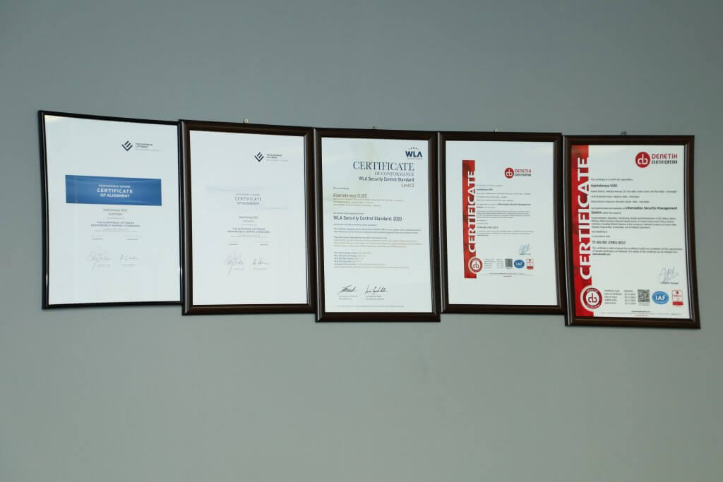 İlk standart ISO 27001:2013 Məlumat Təhlükəsizliyi İdarəetmə Sistemi standartıdır. Bu standart şirkətin fəaliyyətinin, eləcə də təklif etdiyi şans oyunlarının təhlükəsizlik, etibarlılıq və davamlılığını təsdiq edir. Standartın tələblərinə uyğun olaraq şirkət öz dəyərlərini müəyyənləşdirir, məlumat təhlükəsizliyi siyasətini təsdiq edir və təhlükəsizlik sistemini quraraq tətbiq edir. Gələn ildən şirkət bu sertifikatın daha sonrakı versiyası üçün müraciət edəcək.
