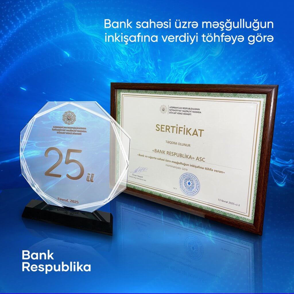 Mükafat, İqtisadiyyat naziri Mikayıl Cabbarov tərəfindən “Bank Respublika”nın İdarə Heyətinin sədr müavini Aslan Abasova təqdim olunub. Bu mükafat, Bankın əmək bazarında yüksək ixtisaslı mütəxəssislərin yetişdirilməsi və sektorda dayanıqlı iş yerlərinin yaradılması istiqamətindəki fəaliyyətlərinin təqdiridir.