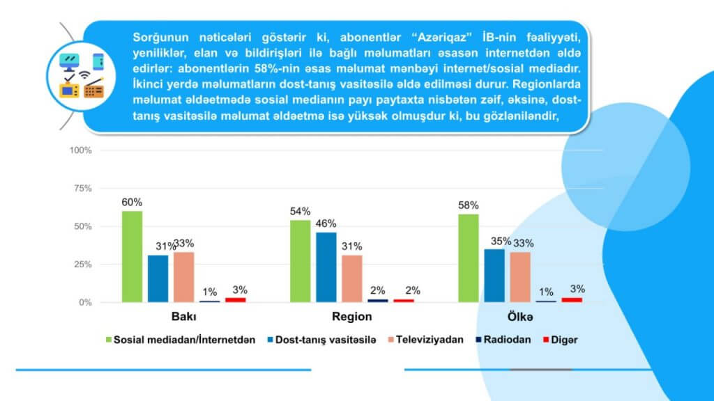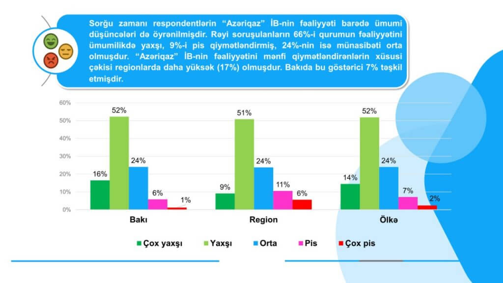 “Azəriqaz” İstehsalat Birliyinin “ASAN xidmət” və “ASAN Kommunal” mərkəzlərindəki xidmətləri, eləcə də Çağrı mərkəzinin və Qəza xidmətinin əməkdaşları barədə abonentlər arasında sorğu aparan “QBS Consulting” MMC son olaraq Birliyin ümumi fəaliyyəti, yenilikləri, elan və bildirişləri necə əldə etmələri ilə bağlı sorğu keçirib.