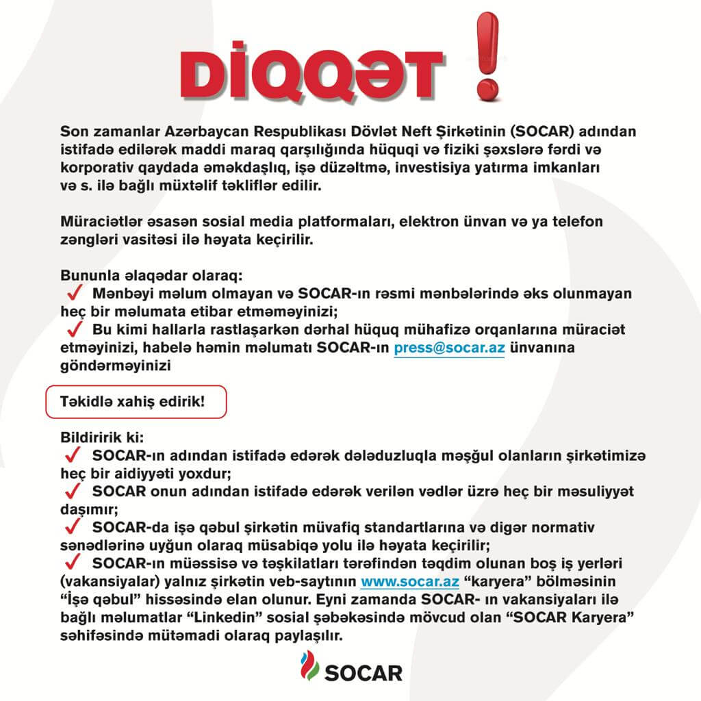 “Artıq müəyyən müddətdir ki, Azərbaycan Respublikası Dövlət Neft Şirkətinin (SOCAR) adından istifadə edilərək maddi maraq qarşılığında hüquqi və fiziki şəxslərə fərdi və korporativ qaydada əməkdaşlıq, işə düzəltmə, investisiya yatırma imkanları və s. ilə bağlı müxtəlif təkliflər edilir. Müraciətlər əsasən, sosial media platformaları, elektron ünvan və ya telefon zəngləri vasitəsilə həyata keçirilir. Bir daha qeyd etmək istərdik ki, SOCAR-ın adından istifadə edərək dələduzluqla məşğul olan şəxslərin şirkətimizə heç bir aidiyyəti yoxdur. SOCAR onun adından istifadə edərək verilən vədlərə görə heç bir məsuliyyət daşımır. Vətəndaşlarımızdan sözügedən hallarla qarşılaşdıqda dərhal müvafiq hüquq-mühafizə orqanlarına müraciət etmələrini və həmin məlumatları [email protected] ünvanına göndərmələrini xahiş edirik”, - müraciətdə vurğulanır.