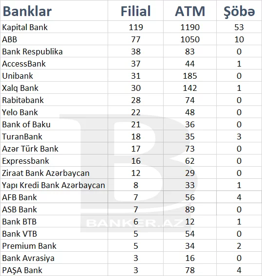 İndex.az "Banker.az"a istinadən xəbər verir ki, hazırda Azərbaycanda 22 bank fəaliyyət göstərir. Xidmət şəbəkəsinin genişliyi istiqamətində isə liderlik Kapital Bankdadır. Bankın ölkə üzrə 119 filialı, 53 şöbəsi və 1190 bankomatı var. Bu göstərici ilə Kapital Bank maliyyə sektorunda birinci yeri tutur. Eyni zamanda ölkənin hər yerində müştəriyə ən yaxın bank imicini möhkəmləndirir. Siyahıda maliyyə sektorunun əsas simalarından biri olan ABB 77 filial, 10 şöbə və 1050 bankomatla 2-ci, Bank Respublika isə 38 filial, 83 ATM ilə 3-cü yerdə qərarlaşır.