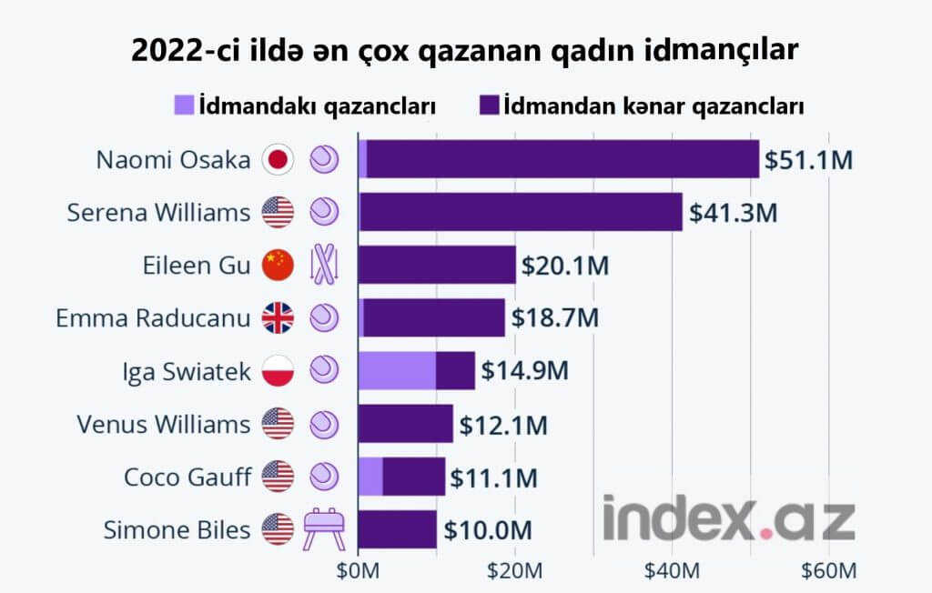 İndex.az xəbər verir ki, yaponiyalı tennisçi ötən il 51.1 milyon dollar qazanc əldə edib. Amerikalı raketka ustası Serena Vilyams isə 2022-ci ili 41.3 milyon dollarlıq qazancla başa vurub.
