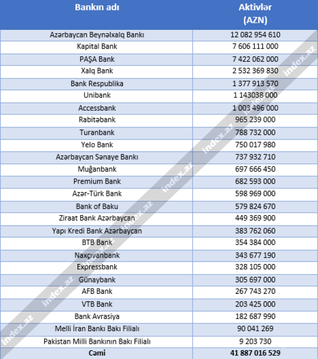 İndex.az-ın araşdırmasına görə, ABB-ın aktivləri 12 milyard manatdır. Aktivləri 7.6 milyard manat olan "Kapital Bank" ikinci, 7.4 milyard manatlıq aktivlərə sahib "PAŞA Bank" bu göstəricidə üçüncüdür.