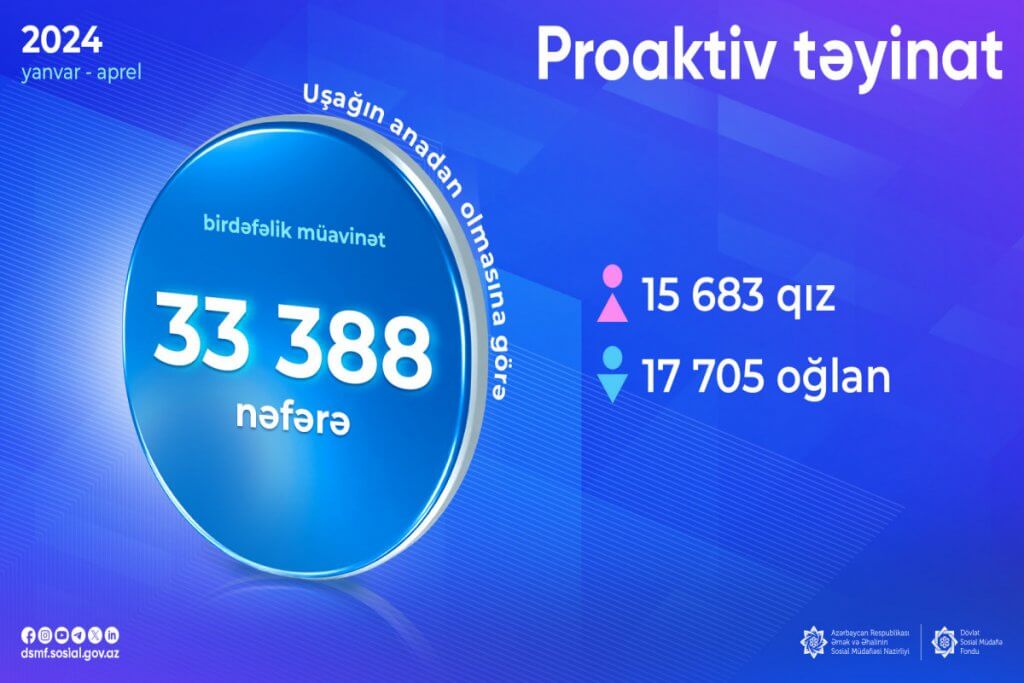 Bu ilin yanvar-aprel ayları ərzində 33 388 nəfərə uşağın anadan olmasına görə proaktiv qaydada birdəfəlik müavinət təyin olunaraq Dövlət Sosial Müdafiə Fondu tərəfindən ödəniş edilib.