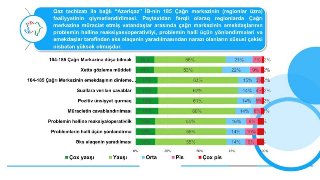 İndex.az xəbər verir ki, sorğuda iştirak edən vətəndaşlar əsasən Çağrı mərkəzində xidmət göstərən əməkdaşların problemin həllinə reaksiyası, operativliyi, problemin həlli üçün yönləndirmələri və əməkdaşlar tərəfindən əks əlaqənin yaradılması istiqamətində fəaliyyətlərini qiymətləndiriblər.