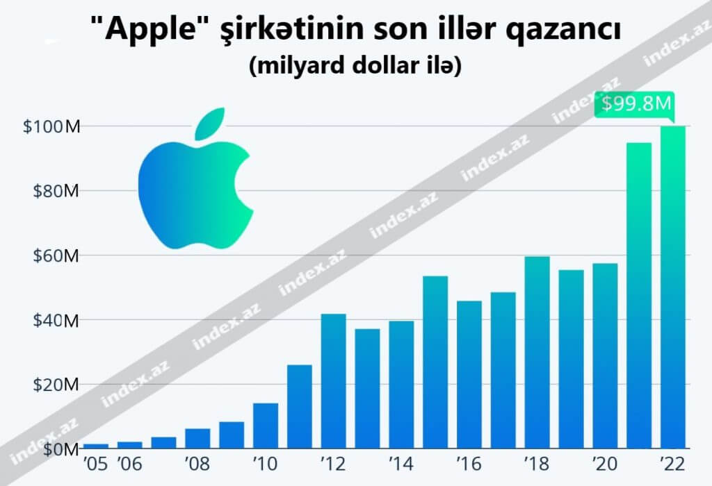 Bununlada "Apple" şirkəti 2022-ci maliyyə ili ərzində ümumi xalis mənfəətini 99,8 milyard dollara çatdırıb.