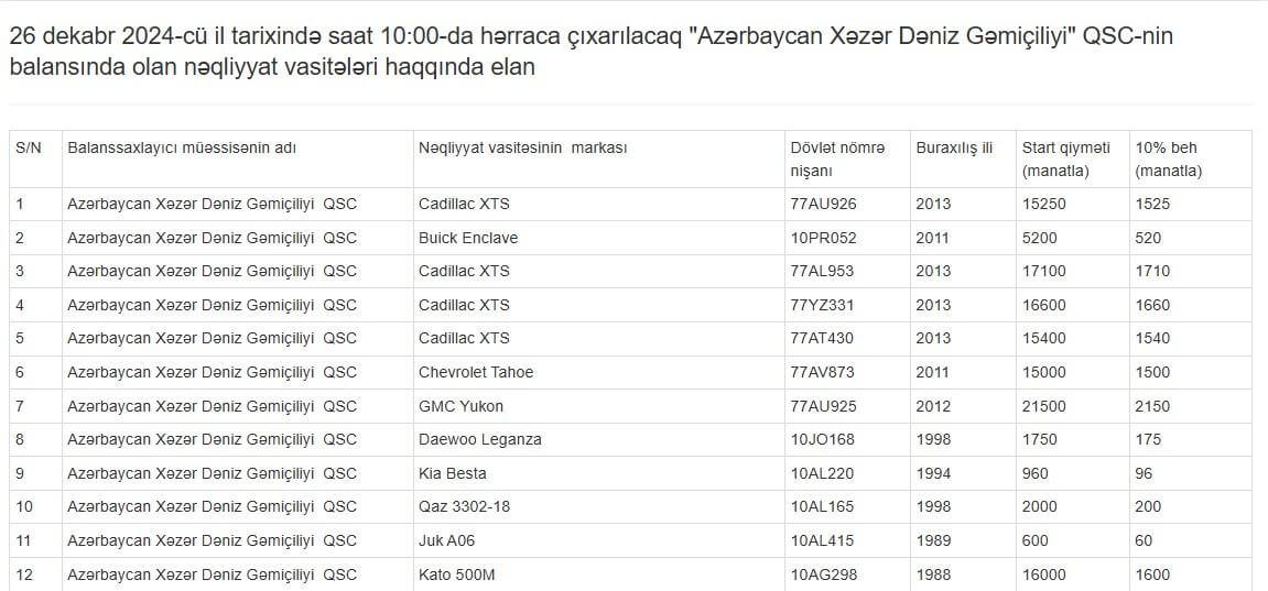 İqtisadiyyat Nazirliyi yanında Əmlak Məsələləri Dövlət Xidməti (ƏMDX) “Azərbaycan Xəzər Dəniz Gəmiçiliyi” QSC-nin (ASCO) balansında olan 12 avtonəqliyyat vasitəsini açıq hərraca çıxarır.
