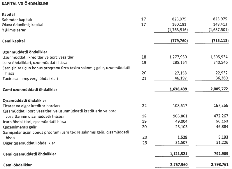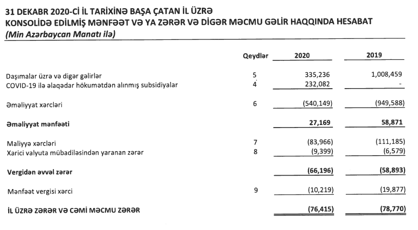 10.22 mln. manatlıq mənfəət vergisi xərcindən sonra onun xalis zərəri 76.41 mln. manat olub. Pandemiyanın hələ ayaq qoymadığı 2019-ci ildə zərərin həcmi 78.77 milyon manat idi.