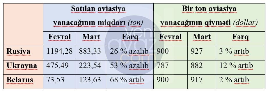 Belarusa satılan aviasiya yanacağının miqdarı isə artıb. Yanacağın qiyməti (gömrük dəyəri) isə hər 3 ölkə üçün artıb. Azərbaycan aviasiya yanacağını ən baha qiymətə Rusiyaya, ən ucuz qiymətə isə Ukraynaya satıb. Fevral ayı ilə müqayisədə isə Ukraynaya satılan yanacağın qiyməti daha çox artıb.