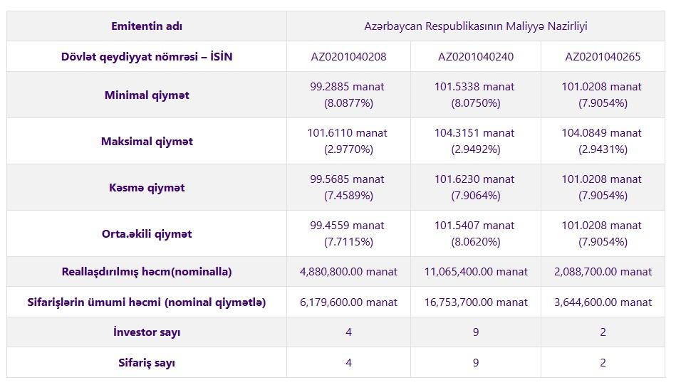 "Bakı Fond Birjası" QSC-də Maliyyə Nazirliyinin yerləşdirdiyi AZ0201040208, AZ0201040240, AZ0201040265 və AZ0201040323 İSİN kodlu dövlət istiqrazlarının vaxtından əvvəl geri alınması üzrə hərrac keçirilib.