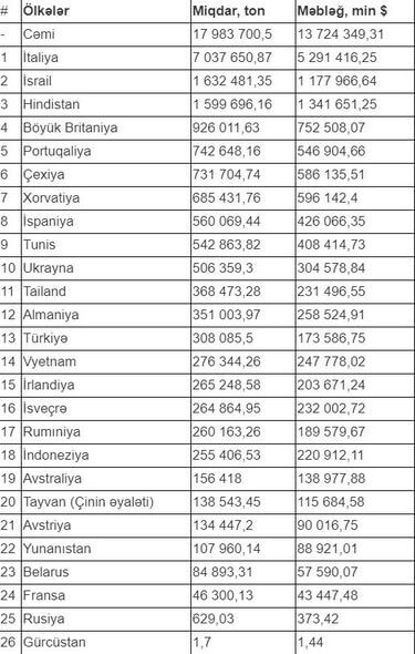 Məlumata əsasən, qeyd olunan göstəricilərdə hesabat dövründə gömrük orqanlarında rəsmiləşdirilməsi başa çatdırılmış ixrac olunan neftin dəyərinə dair məlumatlar nəzərə alınıb. Siyahıdan göründüyü kimi, hesabat dövründə 26 ölkəyə 13 milyard 724 milyon 349 min 310 dollarlıq 17 983 700,5 ton neft ixrac edib.