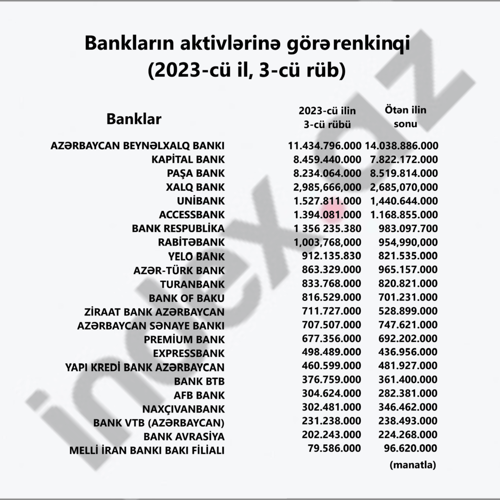Azərbaycan Beynəlxalq Bankının aktivləri 2023-cü ilin 3-cü rübündə ilin əvvəlinə nəzərən 2 milyard 604.090 milyon manat azalmasına baxmayaraq bank bu göstəricidə siyahıda liderdir.