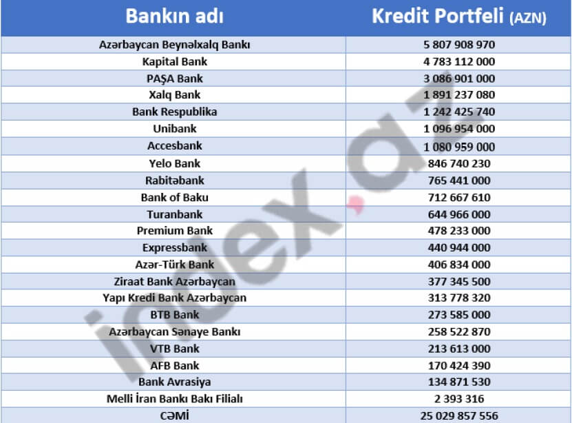 İndex.az Azərbaycanda fəaliyyət göstərən bankların kredit portfeli üzrə renkinqini sizə təqdim edir: