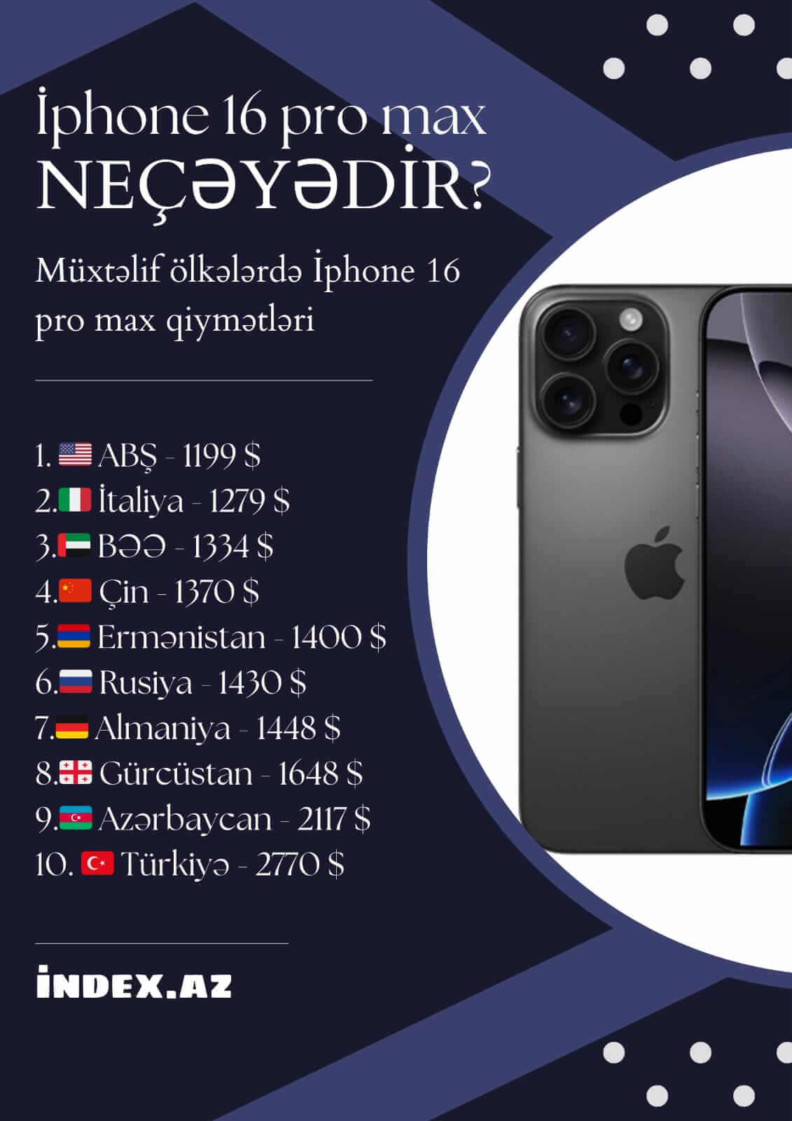 İndex.az-ın araşdırmasına görə, "iPhone 16 Pro Max"ın Azərbaycandakı satış qiyməti 3599 AZN-dir (2117 dollar).