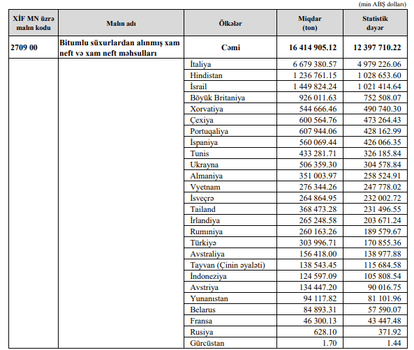 Hesabat dövründə bu ölkəyə 6 mln. 679 min ton həcmində Azərbaycan nefti ixrac olunub.