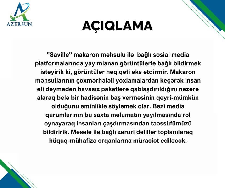“Azərsun Holdinq” “Saville” makaronunun qablaşdırmasında siçanların olması ilə bağlı sosial şəbəkələrdə yayılan görüntülərə aydınlıq gətirib.