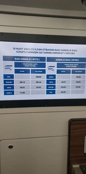 Bu istiqamətdə hərəkət qrafiki də açıqlanıb. Belə ki, Bakı-Qəbələ və əks istiqamətdə qatarın yolda olma müddəti 3 saat 20 dəqiqə olaraq göstərilib.