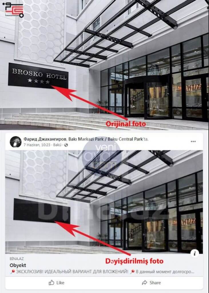 Elana yerləşdirilən fotodan “Brosko” sözünün silinməsi də onu göstərir ki, məqsəd fotonun hansı otelə məxsus olduğunu gizlətməkdən ibarətdir.