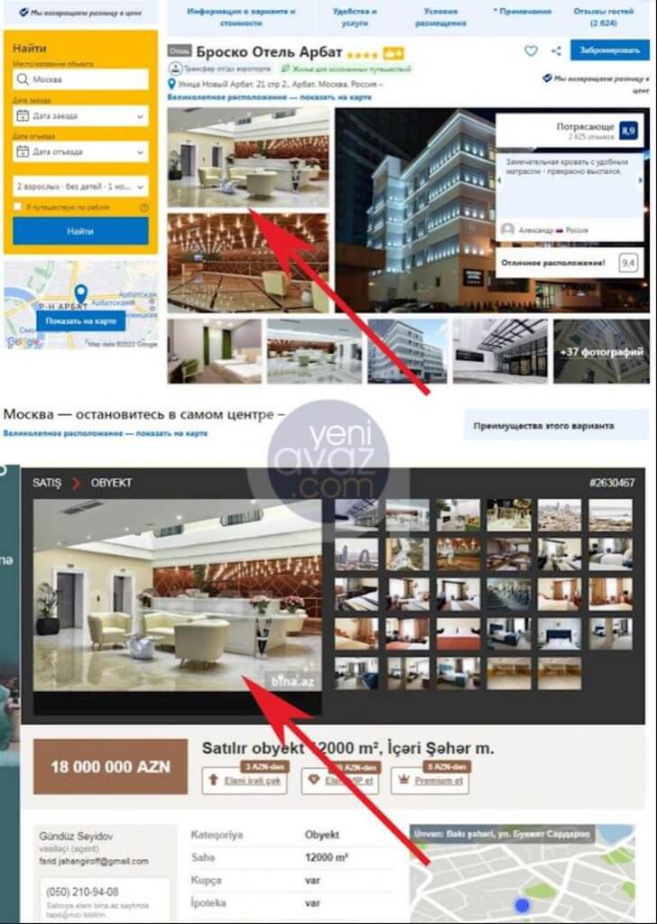 Maraqlıdır ki, satış elanına otelin fotolarını yerləşdirmək əvəzinə Rusiyanın paytaxtı Moskvada fəaliyyət göstərən 4 ulduzlu “Brosko” otelin fotoları yerləşdirilib. Üstəlik, “bina.az” saytına yerləşdirilən fotodan “Brosko” sözü silinib.