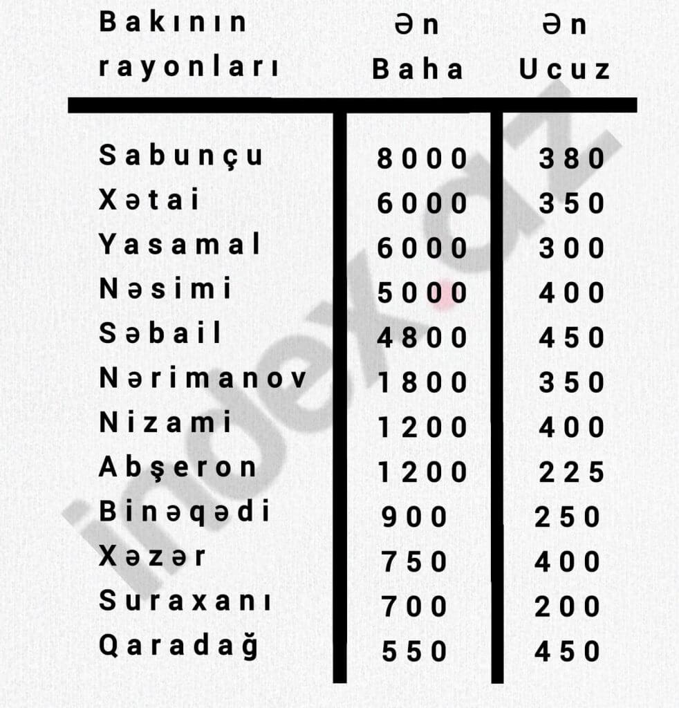 İndex.az Bakının rayonları üzrə ən bahalı və ən ucuz 2 otaqlı kirayə mənzilləri sizə təqdim edir:
