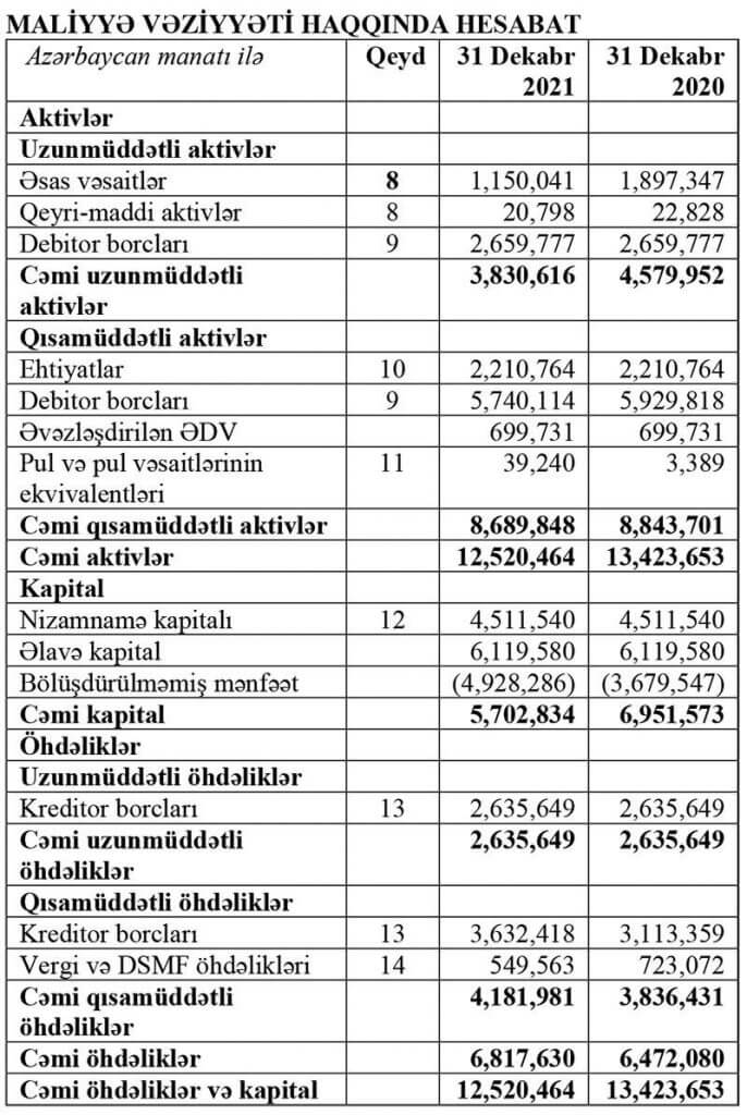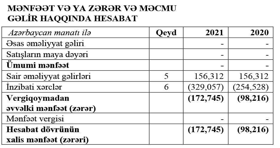 Qeyd edilir ki, şirkət 2021-ci ildə əməliyat gəlirlərindən 145 312 manat gəlir etdiyi halda, 329 057 min manatlıq inzibati xərcləri olub.