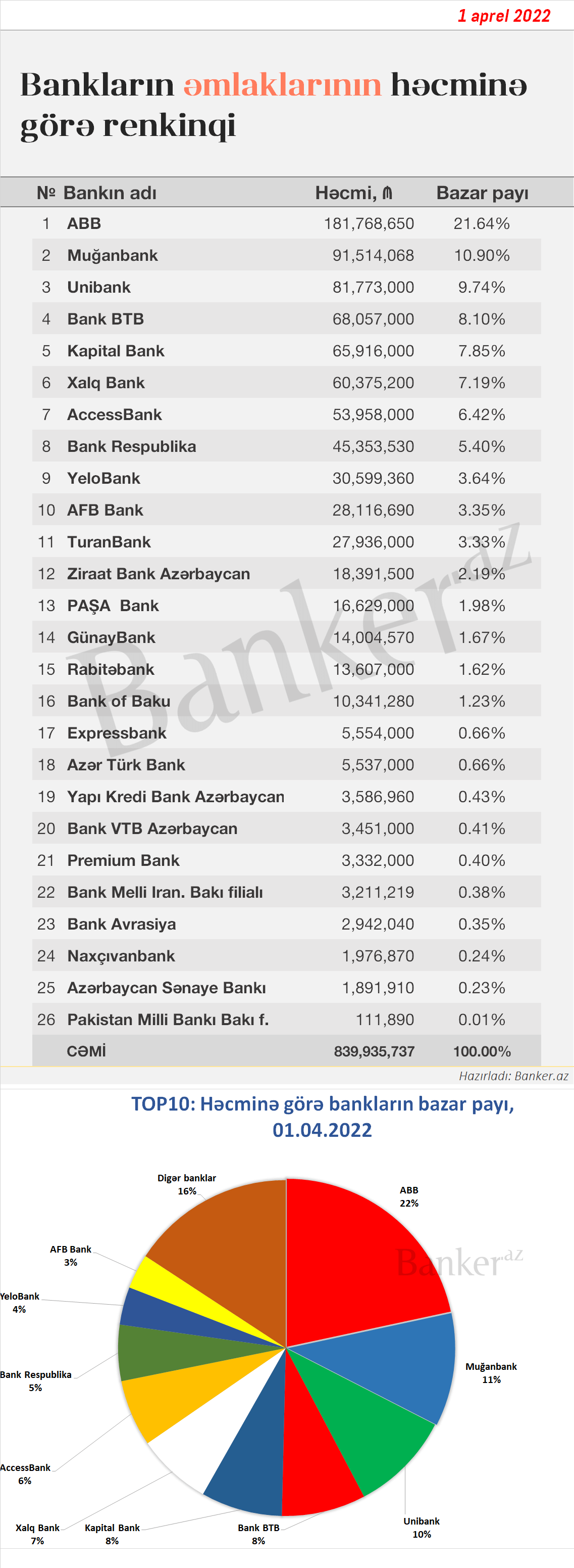 İndex.az xəbər verir ki, 1 aprel 2022-ci il tarixinə bankların əmlaklarının həcminə görə renkinqi açıqlanıb.