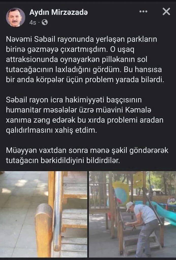 "Mən səhifəmdə gördüyüm bütün işlərlə bağlı paylaşım edirəm. Həm gördüyüm böyük işlər, görüşlər və o cümlədən bu cür statuslar da yazıram. Təəssüf edirəm ki, bəzi insanlar böyük işlərə qiymət vermirlər, amma xırda bir məsələni şişirdirlər. Məgər, deputat haradasa xırda bir qüsurun olduğunu görəndə göz yumub getməlidir? Mən nəvəmlə həmin attraksionda olanda orada 10 nəfər valideyn var idi, amma onların heç biri həmin pilləkənin tutacağının laxladığına əhəmiyyət vermədilər. Hansı ki, onlar müvafiq qurumlara müraciət edə, və yaxud sosial şəbəkədə bu barədə yaza bilərdilər. Nəyə görə belə ictimai biganəlik var?