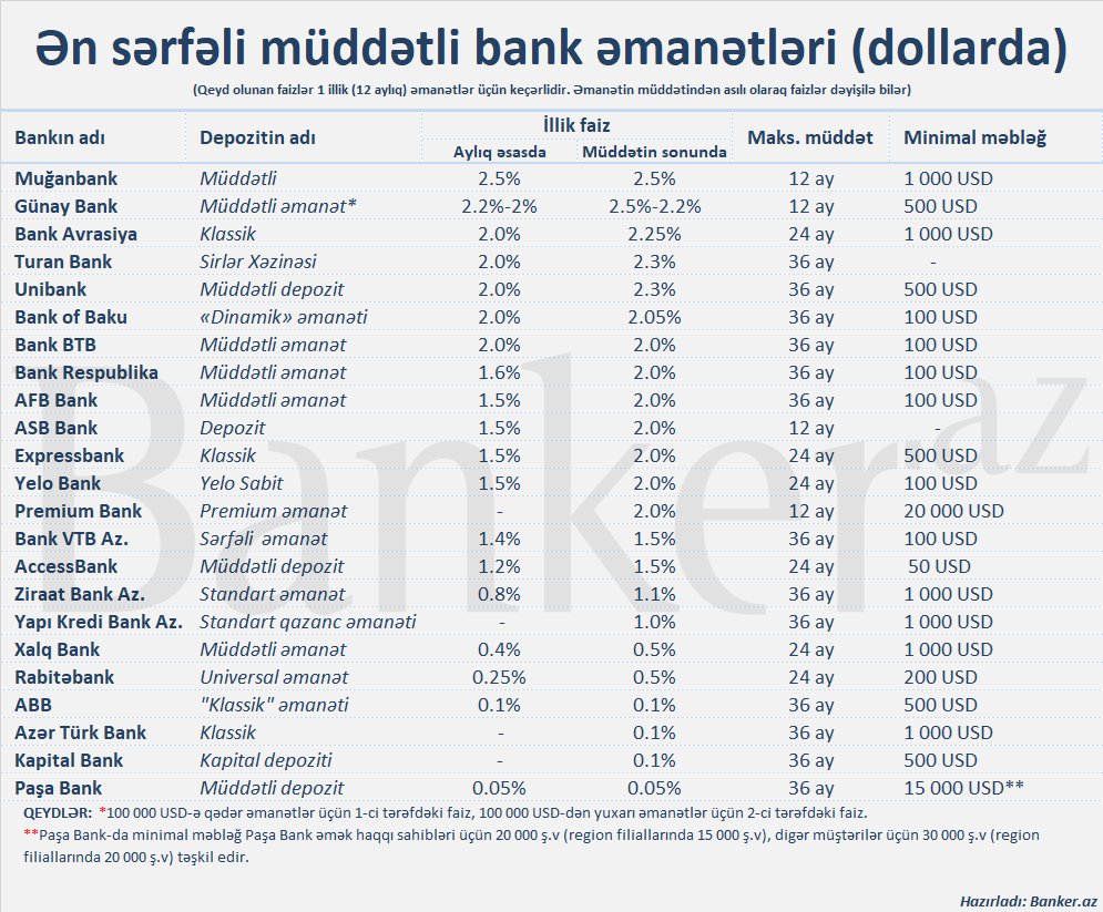İndex.az xəbər verir ki, Banker.az bankların təklif etdiyi müddətli dollar əmanətinin 2022-ci ilin sentyabr ayı üzrə şərtlərini və faiz dərəcələrini araşdırıb.