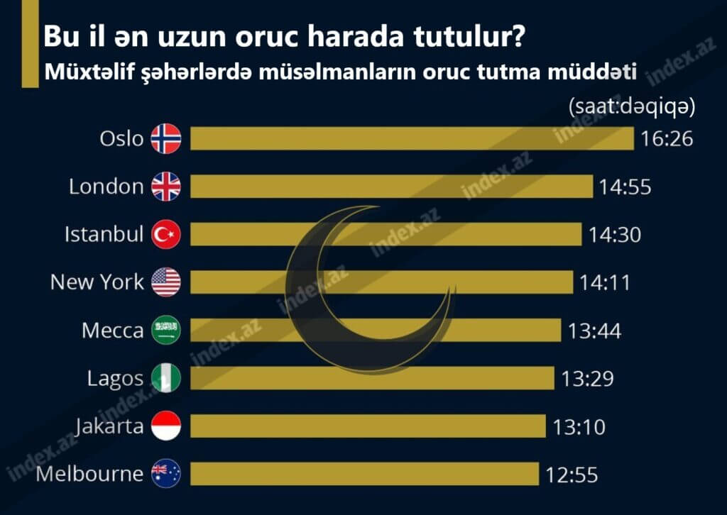 İndex.az xəbər verir ki, Olsoda yaşayan müsəlmanların oruc tutma müddəti 16 saat 26 dəqiqə çəkir. London bu göstəricidə ikincidir.