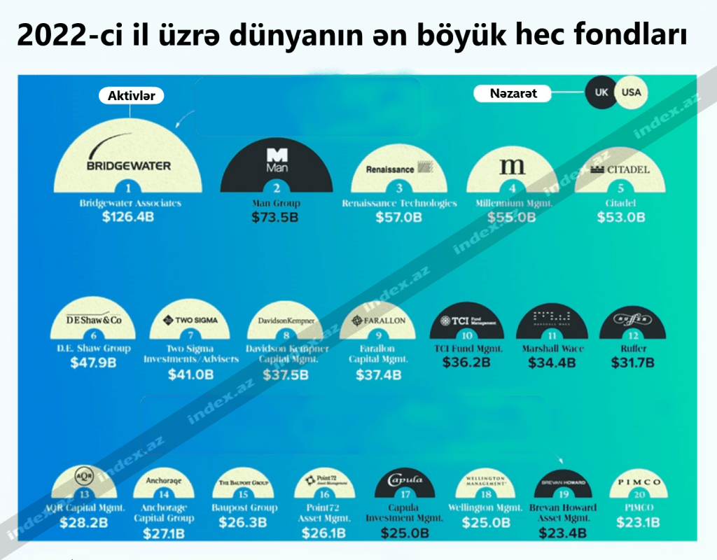 İndex.az xəbər verir ki, həcminə görə fondlar arasında "Bridgewater Associates" fondu liderdir. Siyahının 2-cisi "Man Group" fondudur.