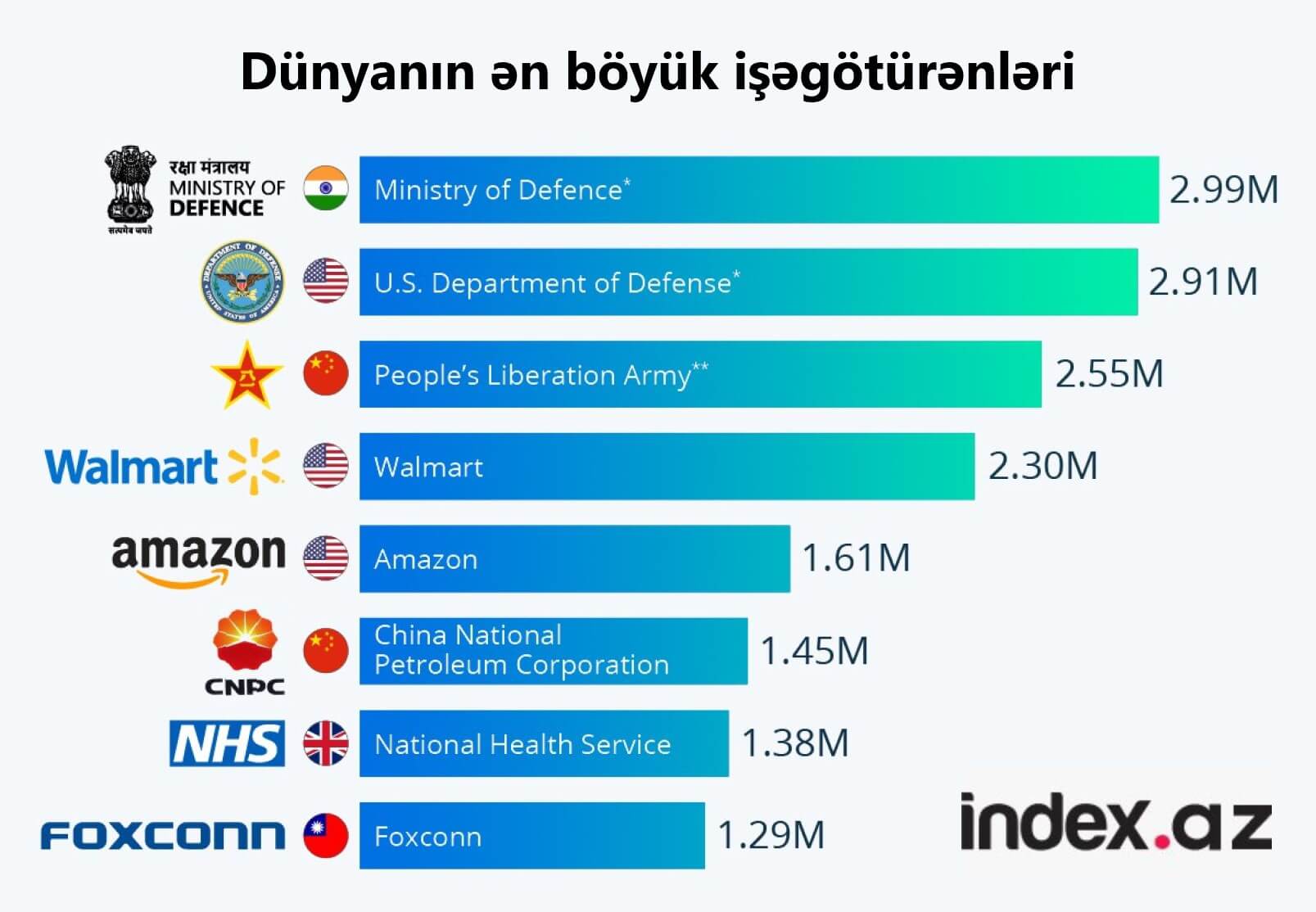 Bu da siyahıda 2-ci olan ABŞ Müdafiə Nazirliyindən 80 min nəfər çoxdur.