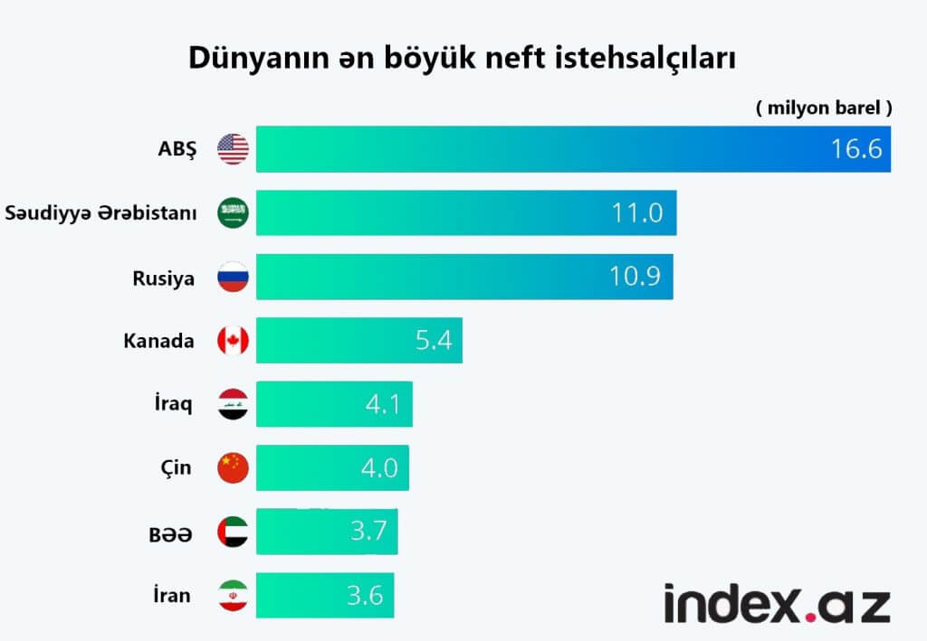İndex.az xəbər verir ki, ABŞ 1 gündə orta hesabla 16.6 milyon barel neft istehsal edir. 11 milyon barellik istehsalla Səudiyyə Ərəbistanı siyahının 2-ci pilləsində qərarlaşıb.