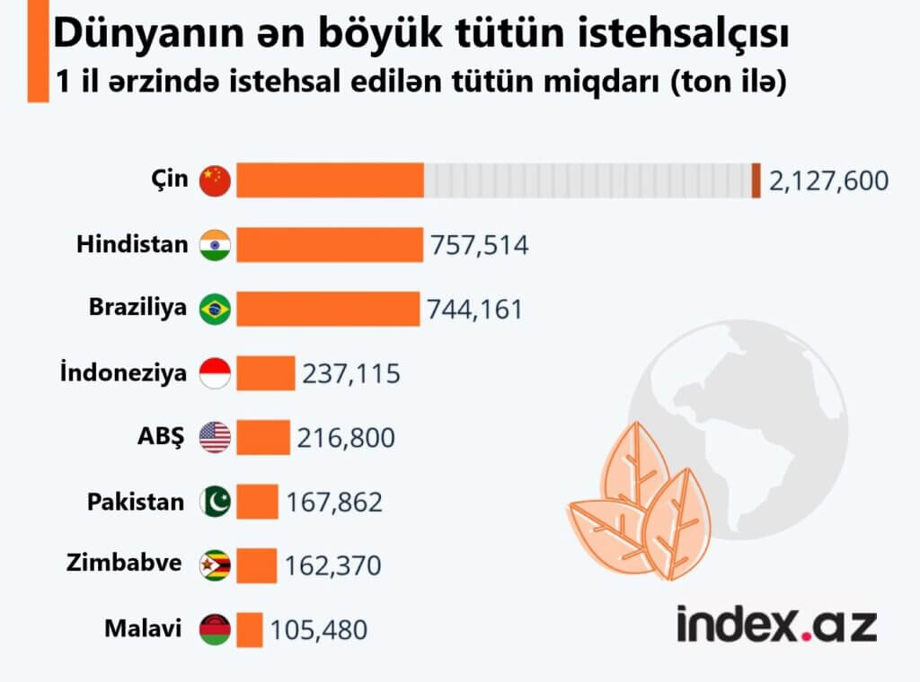 İndex.az xəbər verir ki, Çində 1 il ərzində istehsal olunan tütün miqdarı 2,127,600 tondur.