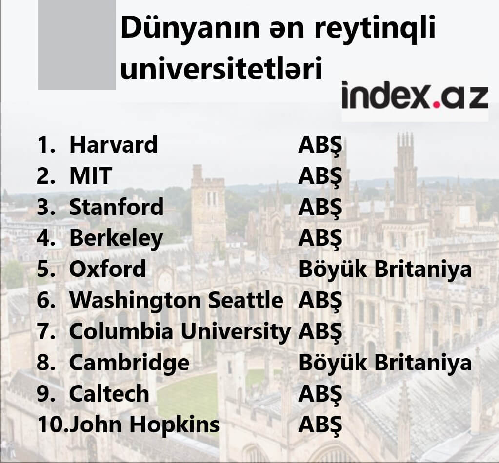 İndex.az xəbər verir ki, MIT siyahıda ikinci, "Stanford" isə üçüncüdür.