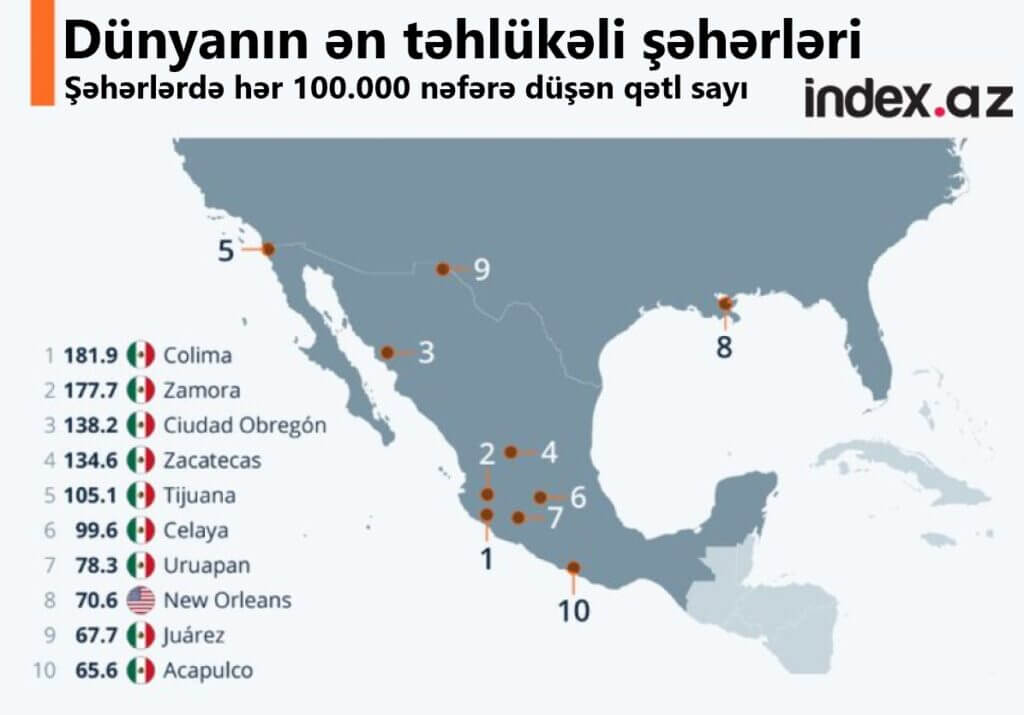 Qeyd edək ki, ilk "10-luq"da olan şəhərlərdən 9-u Meksika şəhərləridir.