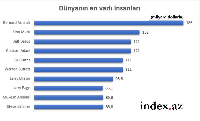 2022-ci il dekabr ayına olan məlumta görə, 186 milyard dollar sərvətə sahib “Louis Vuitton Moët Hennessy” şirkətlər qrupunun təsisçisi Bernar Arno dünyanın ən varlı insanıdır.