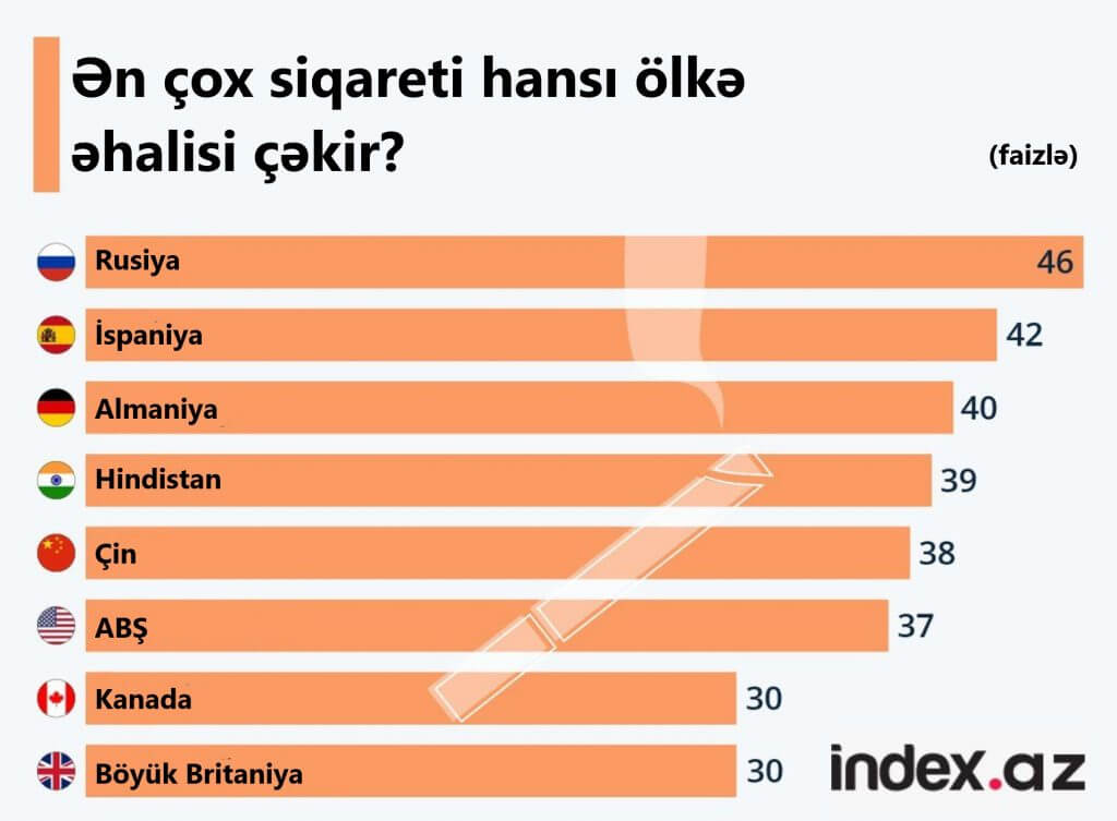 İndex.az xəbər verir ki, Rusiya əhalisinin 46%-i siqaretdən istifadə edir. Əhalisinin 42%-i siqaretdən istifadə edən İspaniya siyahıda ikincidir. İlk üçlüyü 40%-lik göstərici ilə Almaniya tamamlayır.
