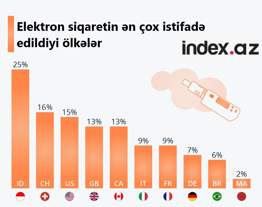 İndex.az xəbər verir ki, İndoneziya əhalisinin 25%-i elektron siqaretlərdən istifadə edir.