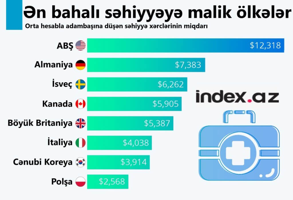 İndex.az xəbər verir ki, ABŞ-da 1 ildə orta hesabla adambaşına düşən səhiyyə xərcləri 12 318 dollardır. Siyahının ikincisi 7 383 dollarlıq səhiyyə xərcinə sahib Almaniya, üçüncüsü isə 6 262 dollar səhiyyə xərci olan İsveçdir.