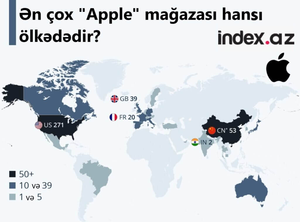 İndex.az xəbər verir ki, "Apple"in ABŞ-da 271 mağazası var. 53 "Apple" mağazasının olduğu Çin siyahıda ikincidir.