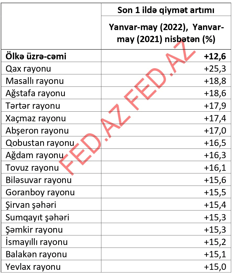 Məlumatların açıqlandığı 58 rayondan 33-də qiymət artımı respublika üzrə orta göstəricidən yüksək, 25 rayonda isə orta göstəricidən aşağı olub.