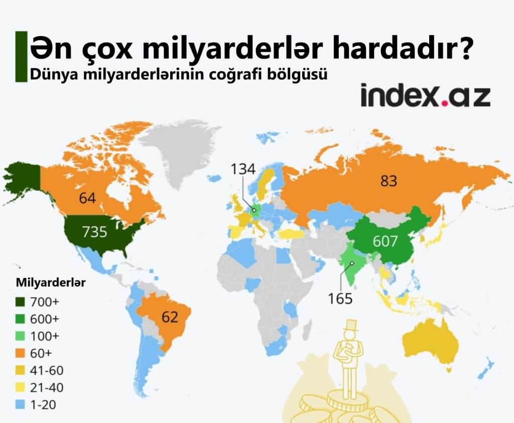 İndex.az xəbər verir ki, ABŞ-da 735 nəfər milyarder var. Çində isə milyarderlərin sayı 607 nəfərdir. İlk üçlüyü 165 nəfər milyarderi ilə Hindistan tamamlayır.