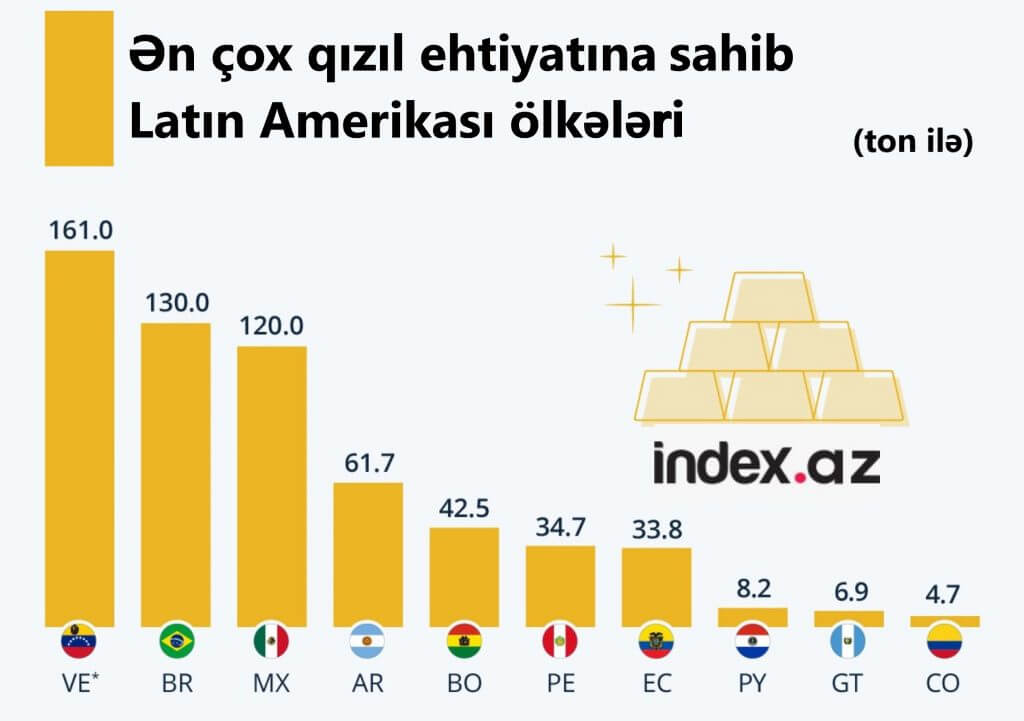 İndex.az xəbər verir ki, Venesuelanın qızıl ehtiyatı 161 ton təşkil edir. Siyahıda ikinci 130 tonluq qızıl ehtiyatı ilə Braziliyadır. İlk üçlüyü 120 ton qızıl ehtiyatına sahib Meksika tamamlayır.