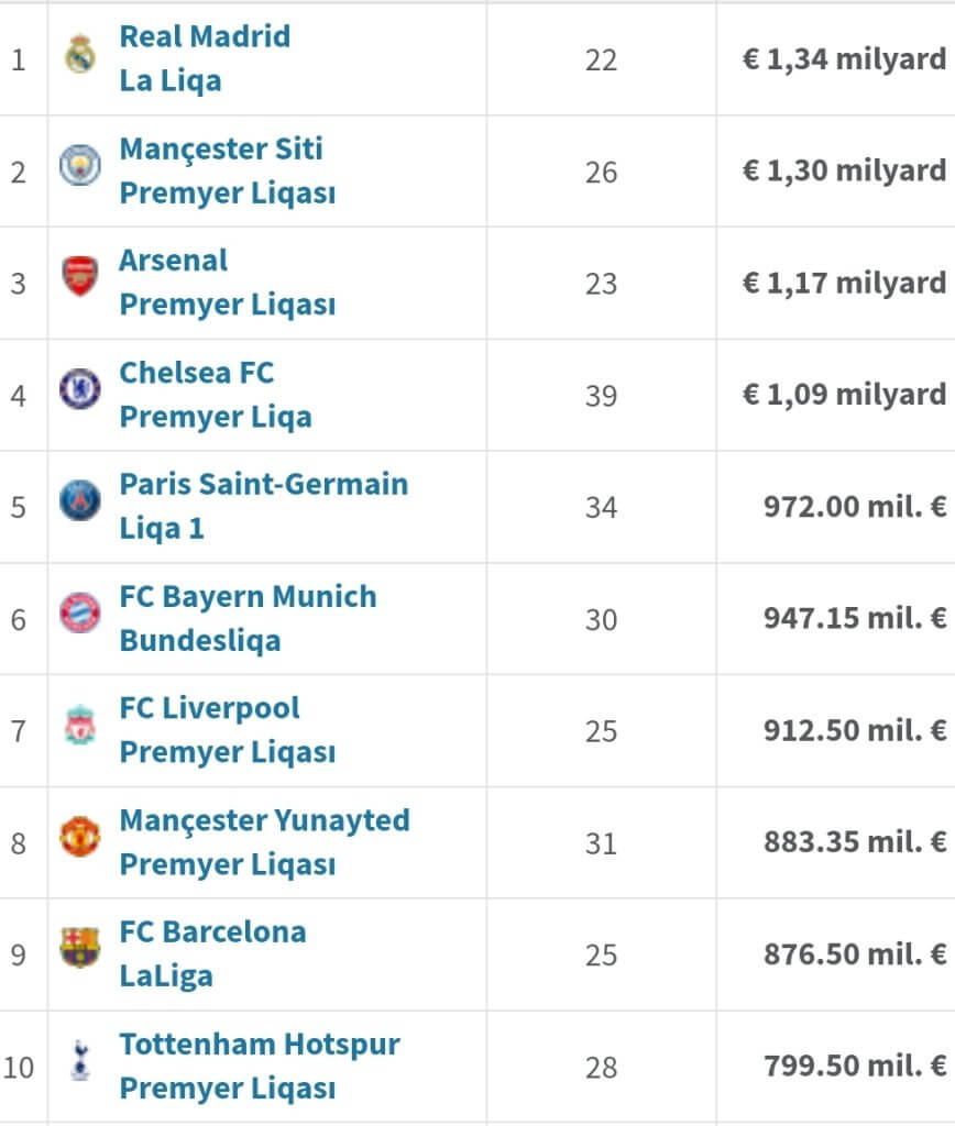 İndex.az xəbər verir ki ispan klubunun heyətinin dəyəri 1,34 milyard avrodur.
