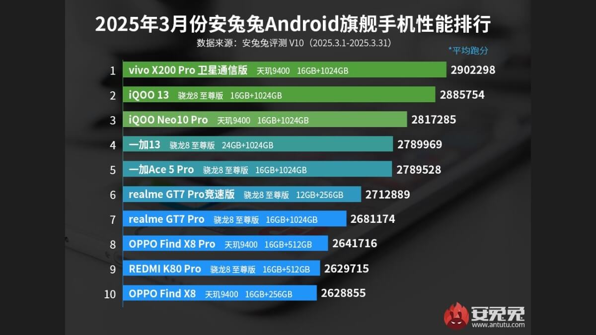 "MediaTek Dimensity 9400" prosessoru ilə təchiz edilmiş vivo "X200 Pro" adlı smartfon "AnTuTu" testində 2 milyon 902 min 298 bal toplayıb. İkinci yerdə 2 milyon 885 min 754 bal toplayan "iQOO 13" qərarlaşıb. Bu telefon "Snapdragon 8 Elite" prosessoruna malikdir.